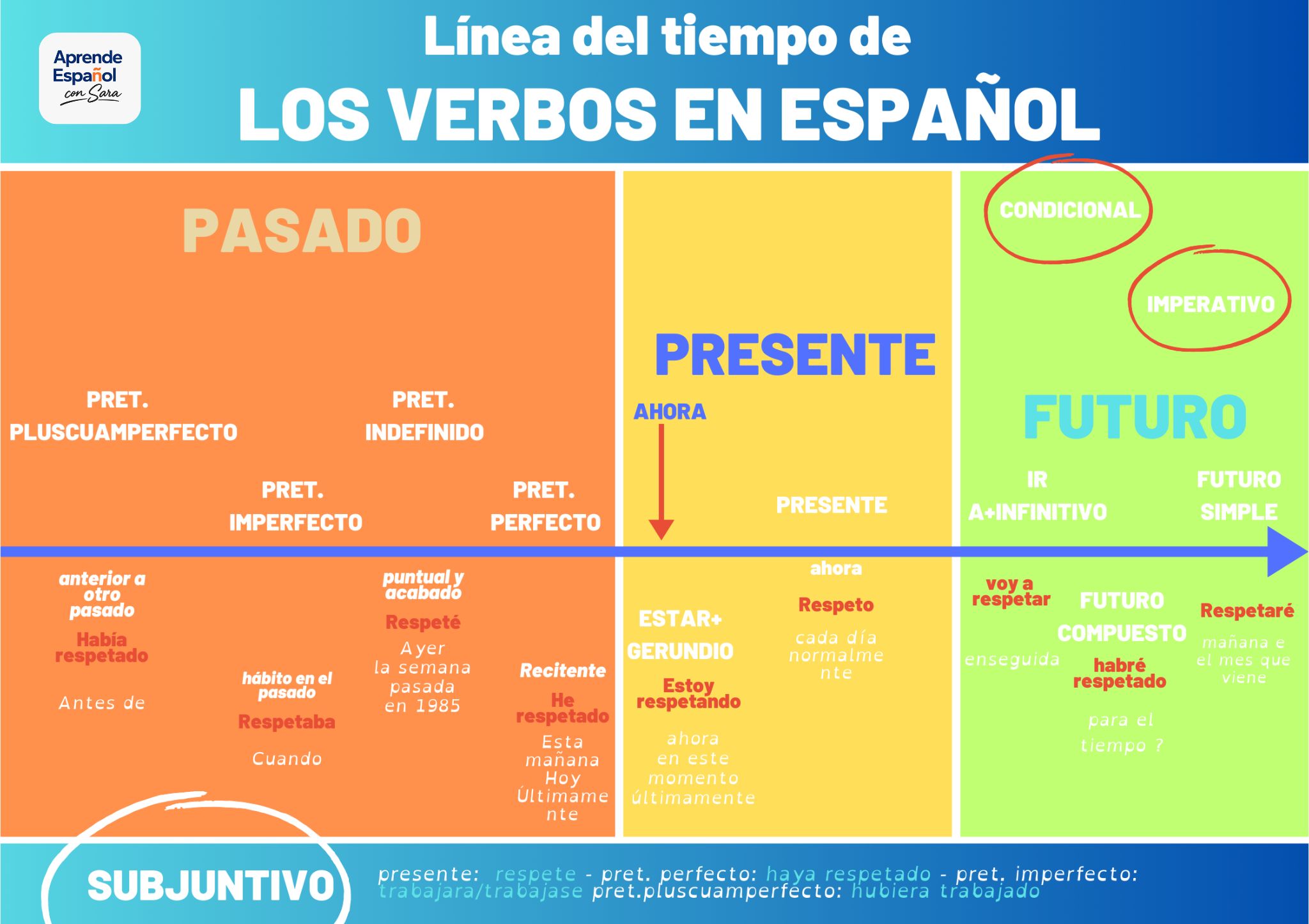 Infografía descargable tipo póster con la línea del tiempo de todos los tiempos verbales en Español.
